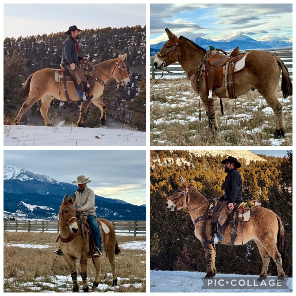 Hatari is one of the friendliest mules we have owned. He is ten years old and a cool golden dun color with lots of zebra striping on his legs. Hatari is gentle. He is just over 14.2 hands and built like a tank. He is out of a Fjord mare and has the easy-going personality of the breed. Hatari is well broke to ride, with a great one-hand neck rein and turn and good stop. He can really walk when asked. Hatari stands to get off and on and is hobble-broke. He has also been packed. He will follow you around the corral like a puppy but is respectful. Hatari is easy to saddle and likes his ears scratched so he’s easy to bridle. He is good about his feet and shoeing. He loads easily in a trailer and gets along with all the other stock. He has been around traffic and dogs with no problems. Hatari would a great family mule. He is easy to vaccinate, worm, and Coggins and is current on all. For more info call (406)222-7455, text (406)223-8380 email blackmtn2@aol.com