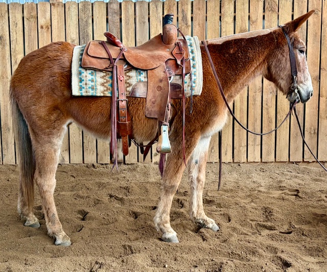 Outstanding, seasoned molly suitable for all riders! Big, smooth stride that covers ground and is easy to sit all day. Excellent neck rein, a lope to die for and a bold mindset makes her a standout! Packs and leads the string! Been to town and shown in a variety of events. Used around ranch and on cattle too. If you’re looking for an all around mule take a look at her! FMI call Katie at (573)881-4041