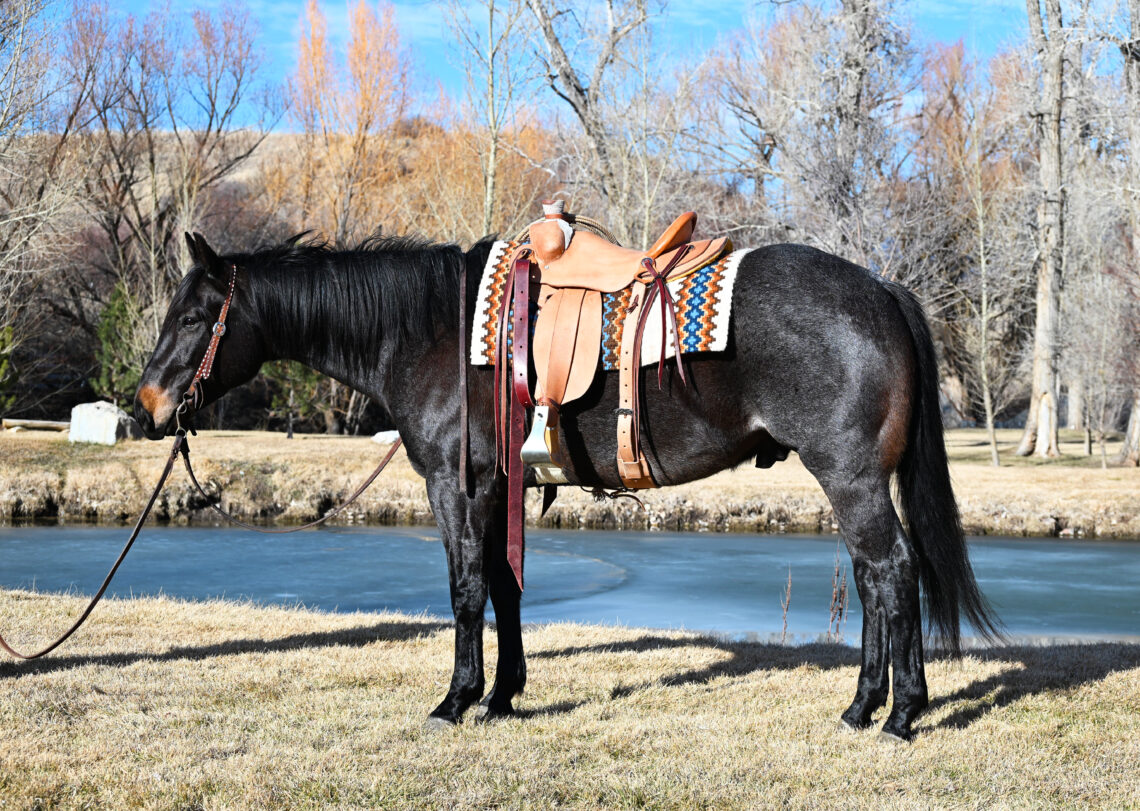 Jake is an outstanding, big, blue roan QH.  He is pretty enough to win a halter class and big and strong enough to do all the mountain stuff and ranch chores.  This horse was raised by a good friend of ours that started him and used him in the sale barn sorting and penning cattle and horses.  We have had him on the ranch and been using him for everything from fall gathering, spring turnout, roping, sorting, etc.  He has seen it all outside –  trail riding, rough, rocky, sage brush and mountainous terrain. He is a big beautiful gelding that will take you anywhere you want to go and look good doing it.  Rides around soft and smooth in the arena, confident and strong outside. Shoes, loads and hauls.  UTD on VX and Worming. FMI Jesse 307-699-1191.
