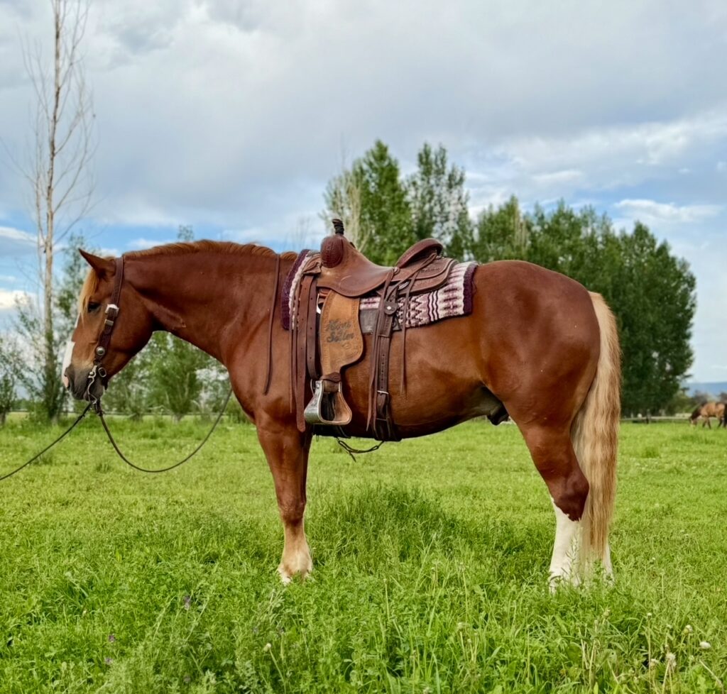 RMO Horses is offering this 2020 Draft Cross gelding, a striking sorrel with a beautiful flaxen mane and tail. He has the solid build, strength, and quiet temperament you’d expect from a quality draft cross. He’s the one that will handle any level of rider young or old, novice or experienced. This gelding is sure-footed and dependable on mountain trails, making him an excellent partner for trail riding and outdoor adventures. He handles water, rough terrain, and long rides confidently and takes good care of the rider on his back.  Experienced and will pack whatever you need on him. He has a calm, willing disposition, making him enjoyable to ride and handle. His sturdy draft cross build provides a comfortable ride and the strength to carry riders with ease. FMI call 801-361-6772.