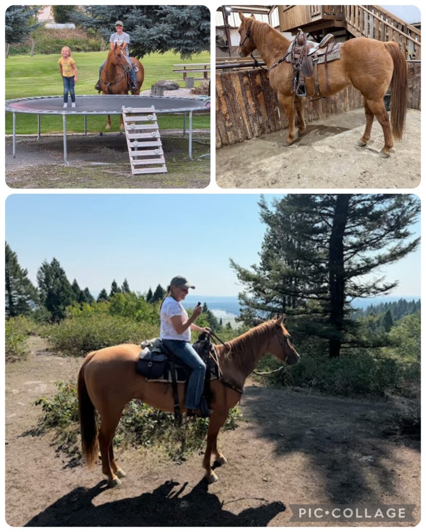 Tango is a 12 year old AQHA Red Dun mare. 15hh and stout. Proficient in Trails and arena work, likes cows, soft in the face. She has a good correct start on barrels and has been introduced to ranch roping. Good to be around,and friendly. Acts as a wonderful babysitter, is very willing to please, great for the farrier. NOT Marish and is low on the pecking order. FMI call 208-390-5011.