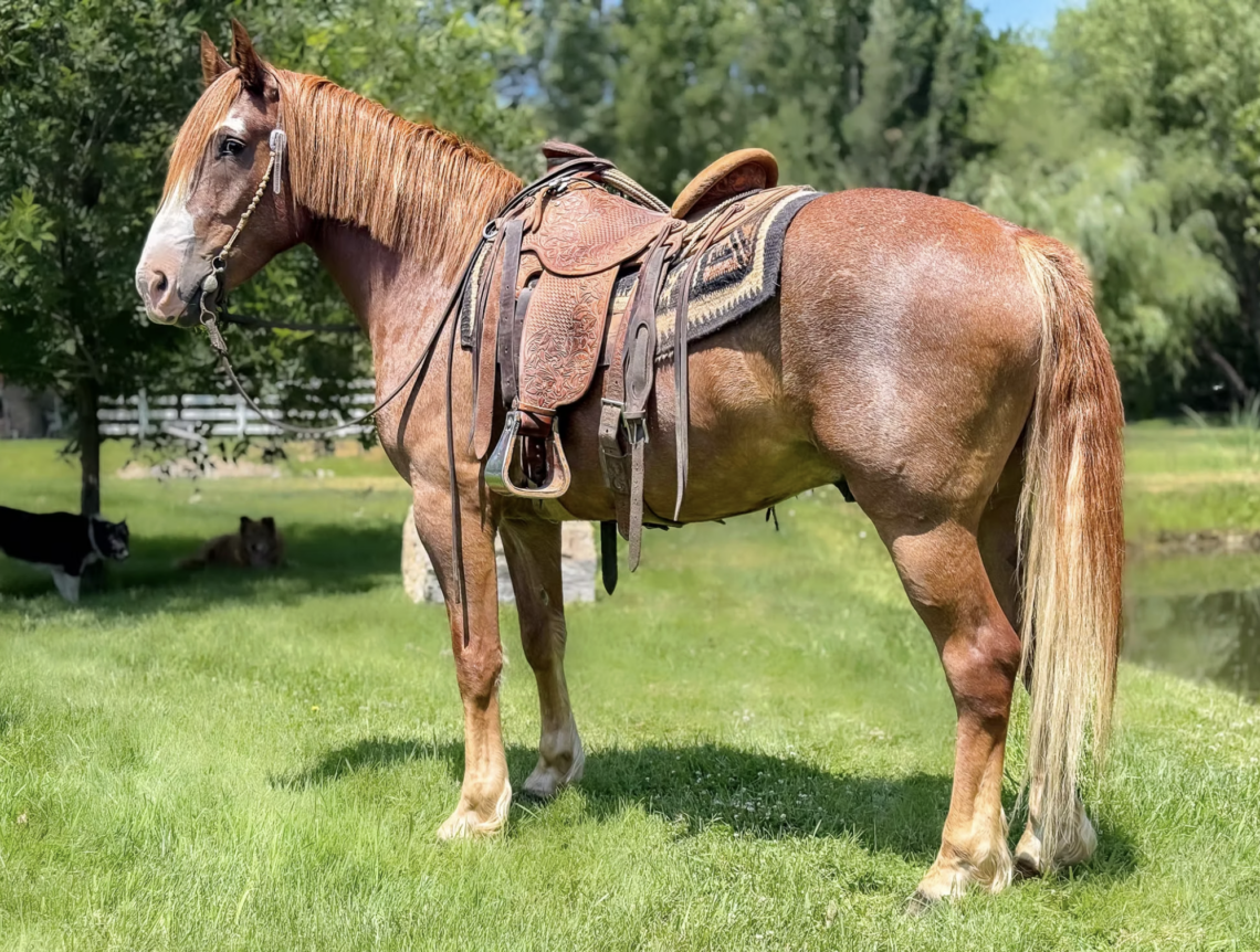 This beautiful 15 hand stocky red roan has been there and done that.  He is great with his feet in the mountains and crosses anything you ask in a careful and gentle manner.  He steps out and travels well.  You will look a long time to find a horse that is such a dream on the trails or in the mountains.   If you need to turn up the heat a bit and get a ranch job done he will match his rider’s live and show up as a reliable ranch mount.  He has been roped off, gathered with and has been ridden by old and young alike. Cody was being ridden and jumped by one of the younger girls at the ranch.  He adores attention and loves to follow her around wherever she goes.  He is the kind of horse that looks for a connection and will be waiting at the gate for you every morning.  We love his infinite willingness and his big heart.  He is easy to get along with and his ground manners make him suitable for lots of various riders.  He ties good, stands for the farrier, loads easy and can be ridden every day or turned out for extend amounts of time and come back the same horse you left.  UTD on VX and Wormer.  FMI call Jesse 307-699-1191