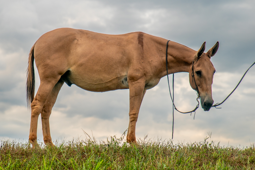 Standing a commanding 16 hands, 2 Story is a 16-year-old dun john mule that checks every