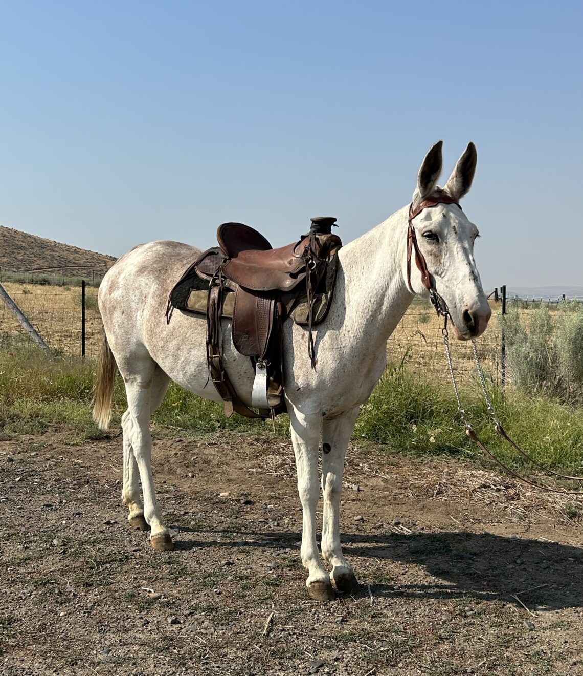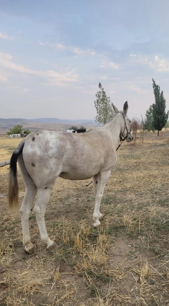 Baby is a 15 H, Molly mule, light brown paint. She has a good rein on her and a good stop. She side passes and really walks out. She’s easy to catch. She’s been ridden in the mountains plus she packed into hunting camp. She packed salt on salt block frames. She was used as an endurance mule and is very athletic. Cart training in progress. FMI call 208-550-5208.